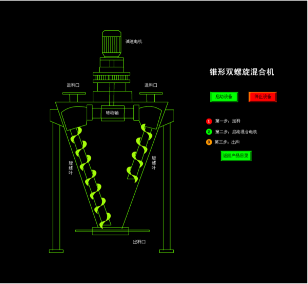 混合机由两根非对称螺旋的快速自转,物料向上提升,形成两股非对称沿筒壁由下向上的螺旋物料流(见图A、B)。转臂带动的螺旋公转运动,使螺旋外的物料不同程度进入螺柱包络线内,一部分物料被错位提升,另一部分物料被抛出螺柱,从而达到全圆周方位物料的不断扩散,被提到上部的两股物料再向中心凹穴汇合,形成一股向下的物料流,补充了底部的空穴,从而形成对流循环。(见图C、D)由于上述运动的反复,物料在较短的时间内获得了均匀混合,混合程度较高。